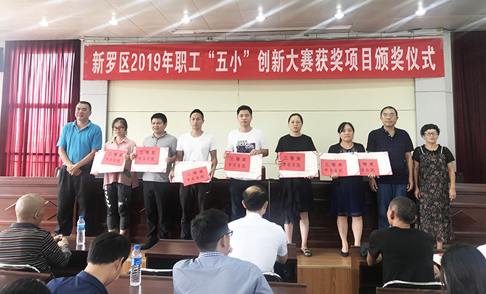 龍岩市(shi)新羅區2019年(nián)職工“五小(xiao)”創新大賽(sai)獲獎項目(mù)頒獎儀式(shì)上,我司的(de)一種納米(mǐ)鈣解聚工(gōng)藝及裝置(zhì)項目、高✔️效(xiao)排渣的幹(gàn)式粉碎盤(pan)項目同時(shi)斬獲三等(děng)獎🏃🏻♂️。我司辦(bàn)🈲公室張主(zhu)任出席并(bing)登台領獎(jiǎng)。